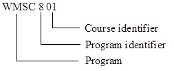 A course will be represented by course number, course title, credit hours and contact hours per week. Each course is designated by a three-letter word identifying the program name followed by a three-digit number as illustrated in the following examples. For the purpose of assessment, 50 marks (points) will be assigned to a 2-credit hours course and 2-contact hours/week will be allocated for the course in each semester. A course code is given below as an example: